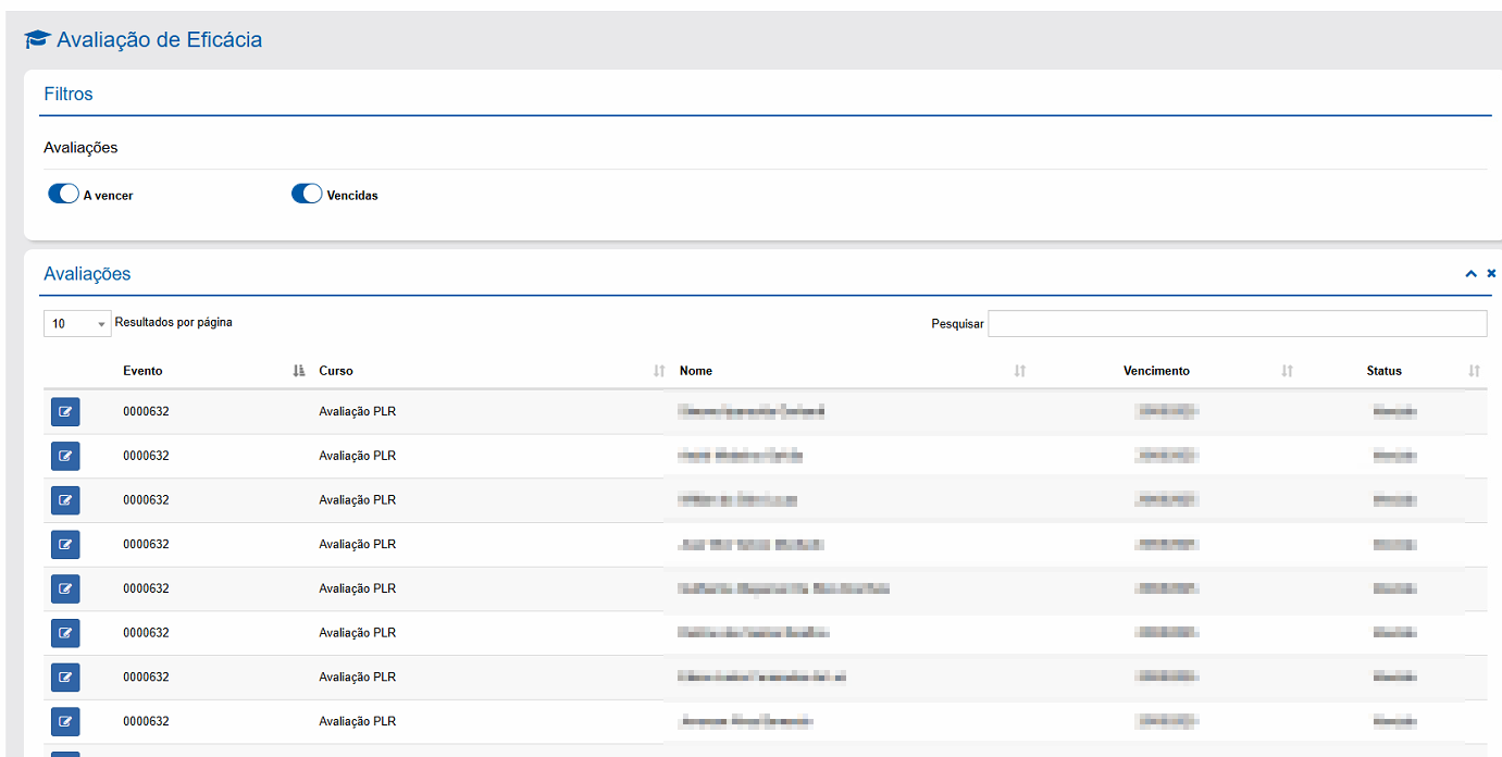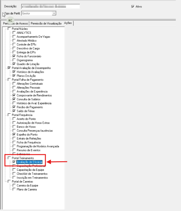 Administração do Sistema > Administração do Portal > Perfis de Usuários, verificar se a opção Avaliação de Eficácia está selecionada.