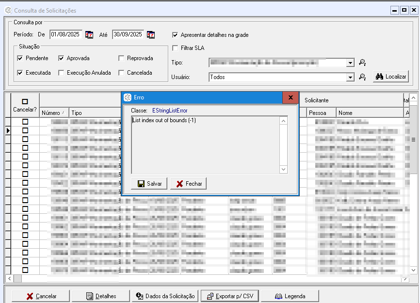 Administração do Portal > Consulta Solicitações, é exibida a seguinte mensagem de erro: