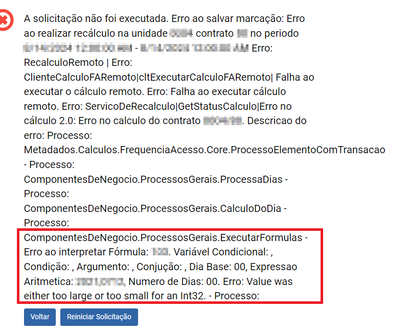 Erro ao salvar marcação: Erro ao realizar recálculo na unidade XXXX contrato XXXX no periodo DD/MM/AAAA HH:MM:SS - DD/MM/AAAA HH:MM:SS. Erro: RecalculoRemoto | Erro: ClienteCalculoFARemoto|cltExecutarCalculoFARemoto|Falha ao executar o cálculo remoto. Erro: Falha ao executar cálculo remoto. Erro: ServicoDeRecalculo|GetStatusCalculo|Erro no cálculo 2.0: Erro no calculo do contrato XXXX/XXXX. Descricao do erro: Descricao do erro: Processo: Metadados.Calculos.FrequenciaAcesso.Core.ProcessoElementoComTransacao - Processo: ComponentesDeNegocio.ProcessosGerais.ProcessaDias - Processo: ComponentesDeNegocio.ProcessosGerais.CalculoDoDia - Processo: ComponentesDeNegocio.ProcessosGerais.ExecutarFormulas - Erro ao interpretar Fórmula: XX. Variável Condicional: , Condição: , Argumento: , Conjução: , Dia Base: 00, Expressao Aritmetica: AAAA,MMDD, Numero de Dias: 00. Erro: Value was either too large or too small for an Int32. - Processo: