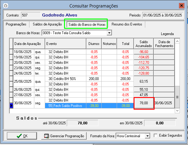 Importante: O cálculo do ponto, geração de eventos e relatórios mostravam o saldo certo, apenas nessa tela de consulta que ficava incorreto.