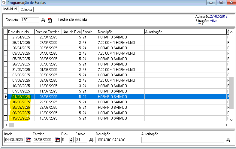 29/09/2025 Programação de escalas. Corrigido problema que acontecia quando existia mais de uma programação de escala para o mesmo período de ponto processado. Nesta condição, o sistema apenas processava a última programação não considerando as outras.