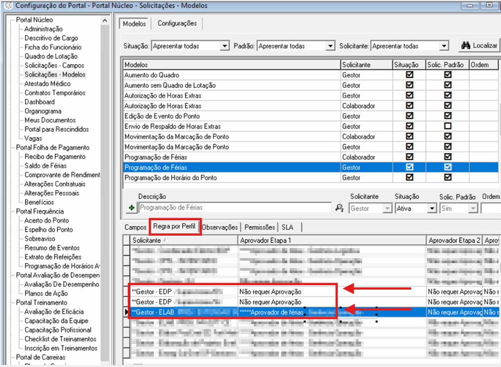 - Acesse a guia Regra por Perfil e ajuste as regras para que todos os perfis do gestor possuam as mesmas etapas de aprovação.