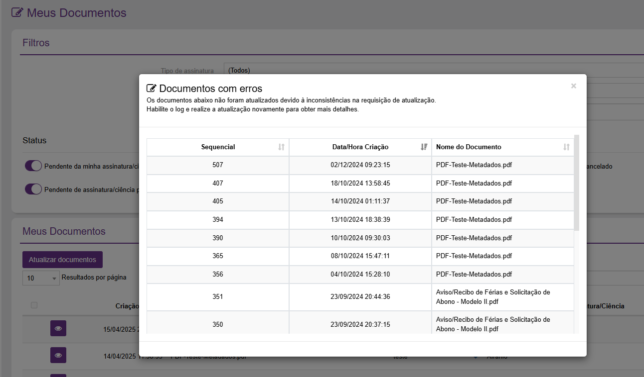 Ao final do processo, será exibida uma mensagem informando quais documentos não foram atualizados.