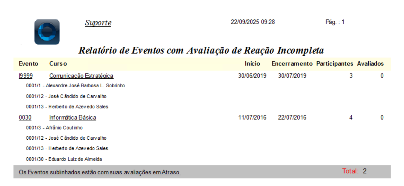 - No módulo Treinamento e Desenvolvimento, acesse o menu: Consultas > Eventos > Avaliação de Reação Incompleta.