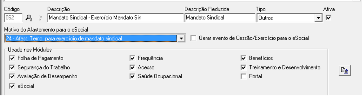 3.1 No campo Motivo de Afastamento para o eSocial, selecione o código 24 - Afast. Temp. para exercício de mandato sindical.