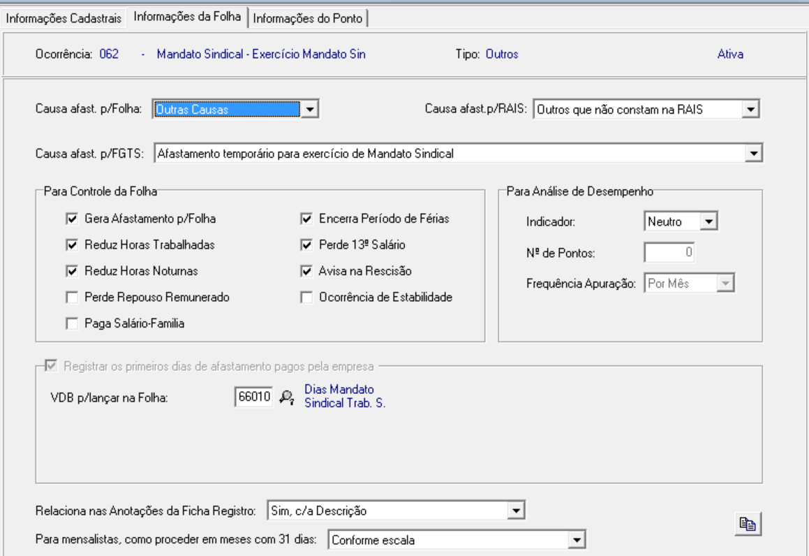 3.2 Na guia Informações da Folha, configure conforme o modelo utilizado para afastamentos de mandato sindical.