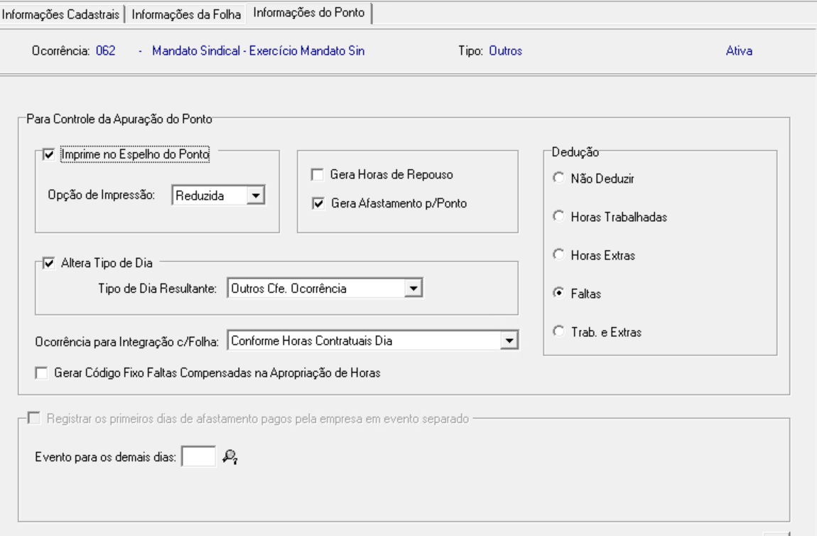 2.1 Na tela de Ocorrências, pesquise pela ocorrência 062: Mandato Sindical – Exercício Mandato Sin.