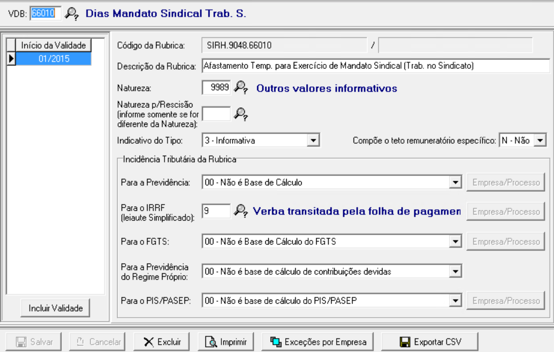 4.1 Utilize o seguinte VDB: 66010 - Dias Mandato Sindical Trab. S. para o lançamento na folha.