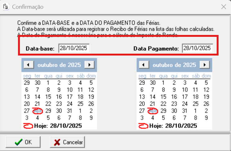 - Para o cálculo de férias, a data-base deve ser sempre igual à data de pagamento.