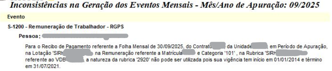 SITUAÇÃO: Ao enviar os eventos mensais, no evento S-1200 ocorre a crítica: "Para o recibo de Pagamento referente a Folha Mensal de xx/xx/xxxx, do Contrato 'xxx', da Unidade 'xxx', em Período de Apuração, na Lotação 'xxx', na Remuneração referente a Matrícula 'xxx' e categoria 'xxx', na Rúbrica 'xxx' referente ao VDB 'xxx', a natureza da rubrica '2920' não pode ser utilizada pois sua vigência tem início em 01/01/2014 e término em 31/07/2021"