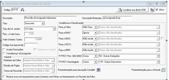 3.2 Após configurar a diretriz e cadastrar os VDBs, o sistema estará apto a calcular automaticamente as provisões de empréstimos consignados na folha de férias.