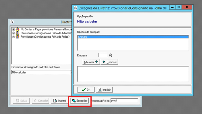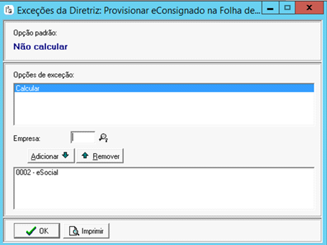 Exemplo: se na diretriz principal estiver configurado Calcular, e a empresa 002 for informada nas exceções, a provisão não será calculada para essa empresa.