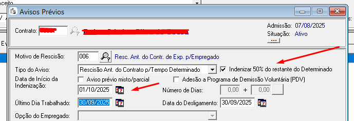 3.Ao gerar o Aviso Prévio , se atentar na data de início da indenização, pois não deve ser posterior a data FIM vencimento do contrato.
