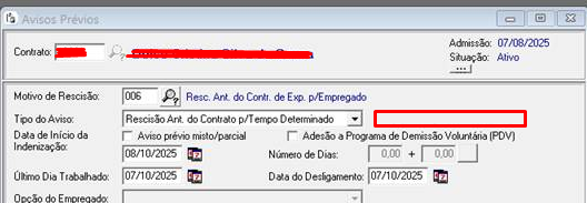 Ao gerar o Aviso Prévio a opção: (Indenizar 50% do restante do Determinado) não está aparecendo para ser marcada para controlar a multa de direito, devido a antecipação do término do contrato para pagamento ao funcionário.
