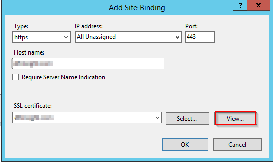 Acesse o servidor do Portal RH → Gerenciador do IIS → Site do PortalRH → Bindings (Associações) → Edit → View Certificate.