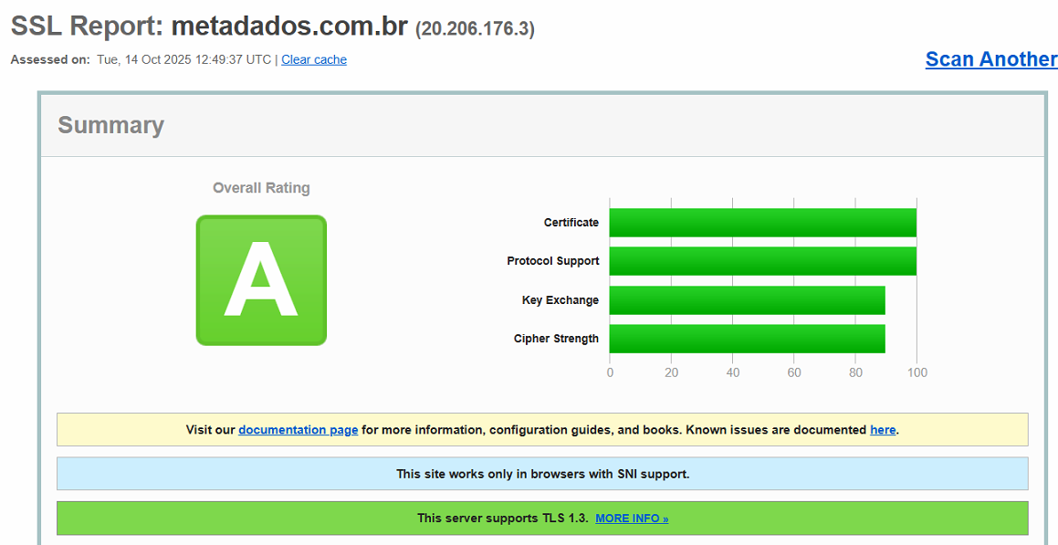 Para garantir o pleno funcionamento do Portal RH em todos os dispositivos, é essencial que o certificado SSL do servidor apresente avaliação “A” ou superior na ferramenta SSL Labs.