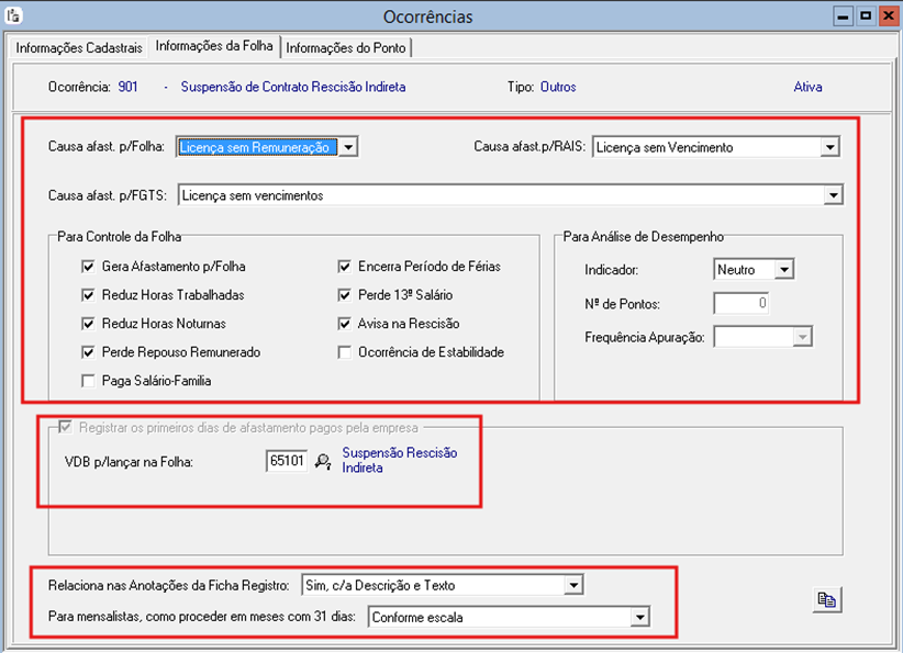 Cadastre o VDB de Base Suspensão Rescisão Indireta para a folha de pagamento.