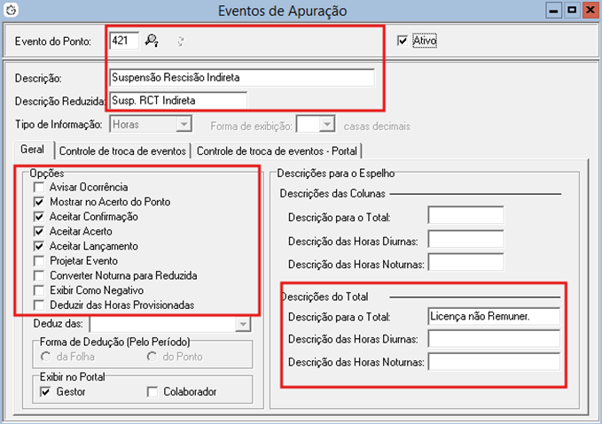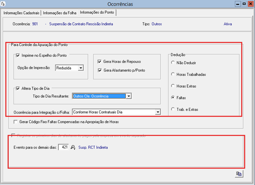 - Na guia Informações do Ponto, configure o cadastro da ocorrência conforme imagem abaixo, vinculando o evento cadastrado no módulo Frequência para os demais dias.