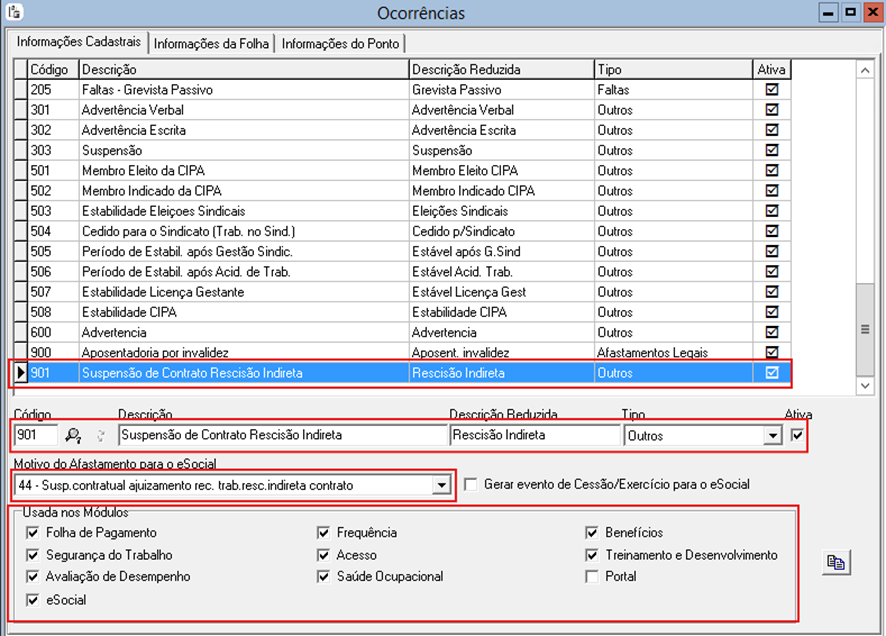Código 44 - Suspensão Contratual Decorrente de Ajuizamento de Reclamação Trabalhista Pleiteando Rescisão Indireta do Contrato: este novo motivo de afastamento permite que os empregadores suspendam o contrato de trabalho de empregados ativos que ingressarem com reclamação trabalhista junto à Justiça do Trabalho, pleiteando a rescisão indireta do contrato de trabalho.