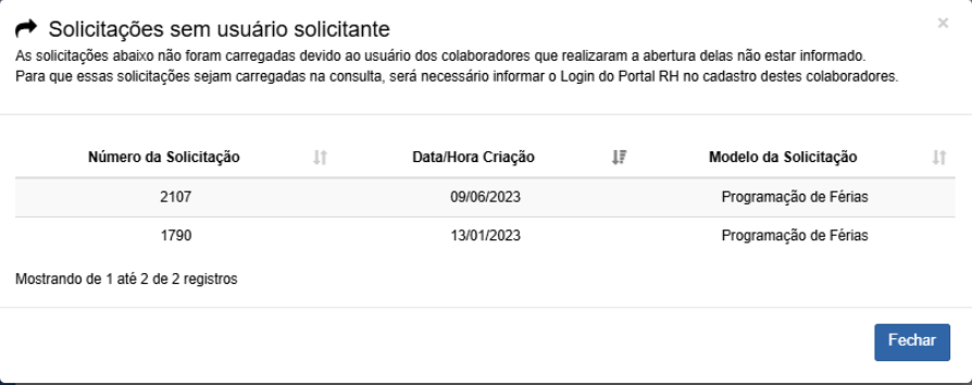 As solicitações abaixo não foram carregadas devido ao usuário dos colaboradores que realizaram a abertura delas não estar informado. Para que essas solicitações sejam carregadas na consulta, será necessário informar o Login do Portal RH no cadastro destes colaboradores.