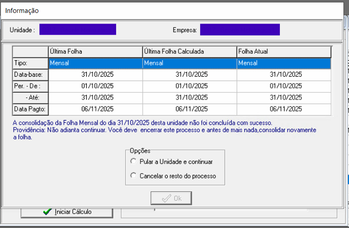Ao calcular uma folha mensal e houver um impedimento do cálculo com a seguinte mensagem: