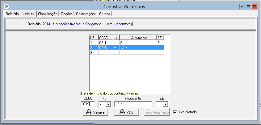 Caso os subcontratos estejam sendo listados no relatório RHPR2010 (Apuração dos Funcionários) e não deseja que eles apareçam, configurar na aba seleção a variável DTIS (data de início do subcontrato) igual a data em branco, conforme exemplo abaixo: