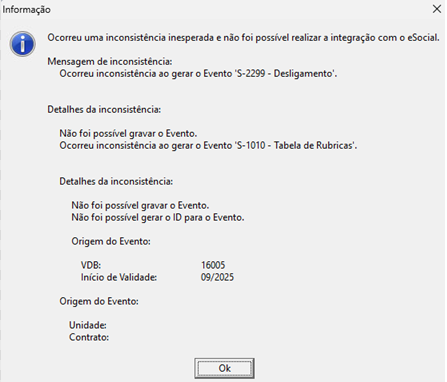 Ocorreu inconsistência ao gerar o Evento 'S-2299 - Desligamento'.