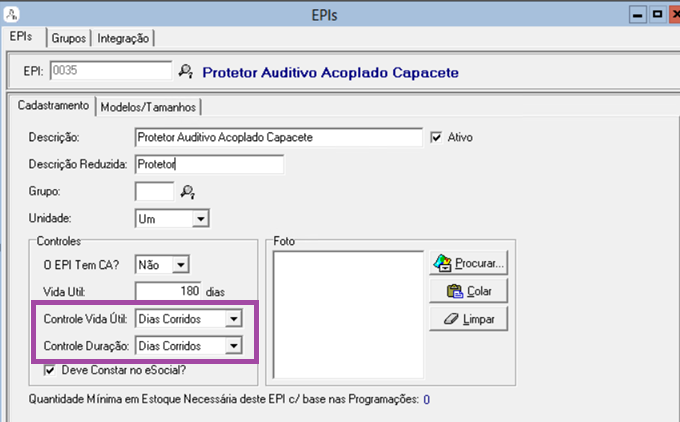 Verifique a informação no cadastro do EPI nos campos Controle Vida Útil e Controle Duração.