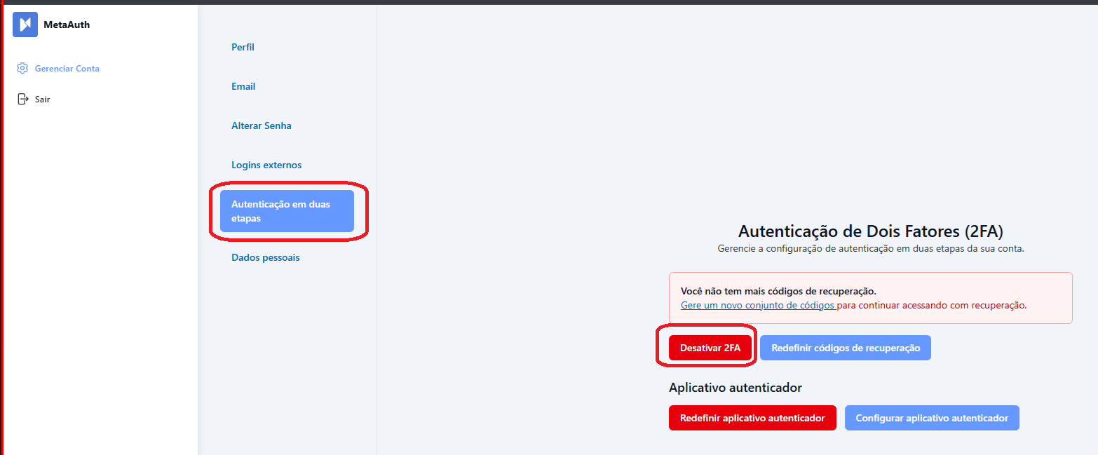 Para desabilitar o MFA é necessÔrio acessar o link https://metaauth2.metadados.dev/Account/Login com seu e-mail e senha e clicar no menu "Autenticação em duas etapas" e após em "Desativar 2FA" e seguir os processos descritos em tela.