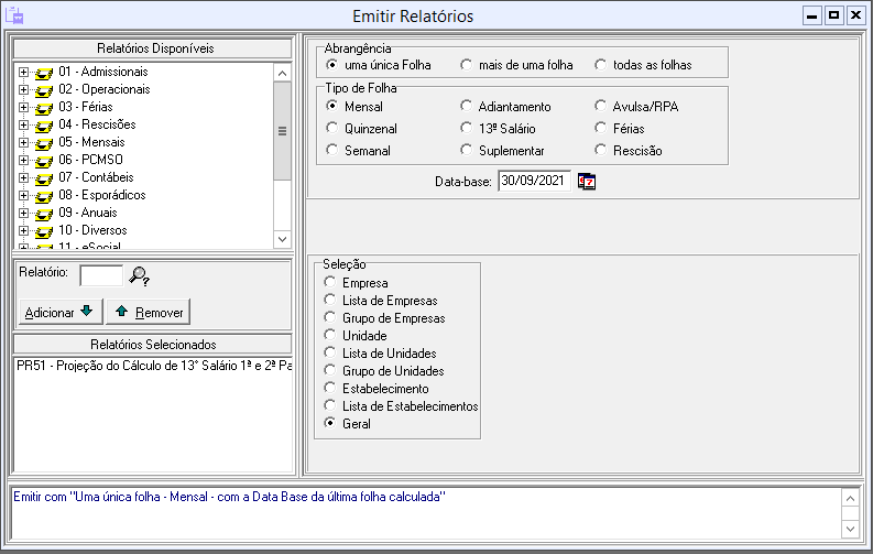 1. No Módulo Folha de Pagamento, acesse o Menu: Relatórios > Emitir Relatórios, informe o relatório PR51 - Projeção do Cálculo de 13° Salário 1ª e 2ª Parcelas.