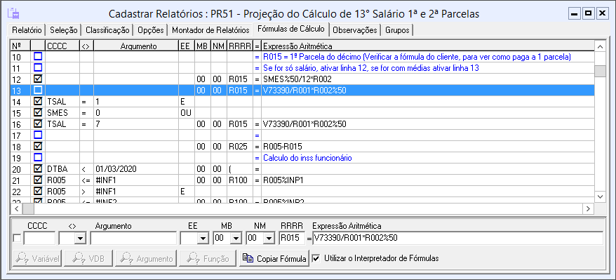 - Caso necessite da primeira parcela sobre salário + variáveis, acesse o Menu: Arquivo > Cadastrar Relatórios, informe o relatório PR51, na guia Fórmula para R015, Desative a linha do SMES%50 e Ative a linha do VDB Total Provisão de 13º Salário, na imagem abaixo desative a linha 12 e ative a linha 13.