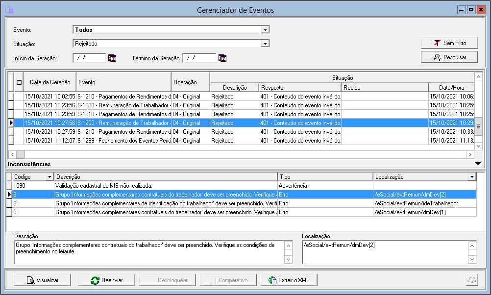 8. No Menu: eSocial > Geração dos Eventos Mensais, informe a Empresa, Período, marque Remuneração/Pagamento e clique no botão Sem Filtro, e filtre a pessoa em questão.