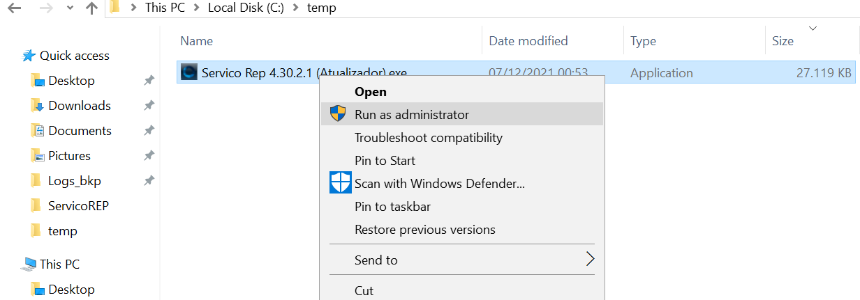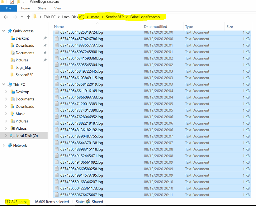 1. Elimine todos os arquivos de logs existentes na pasta C:\meta\ServicoREP\PainelLogsExcecao