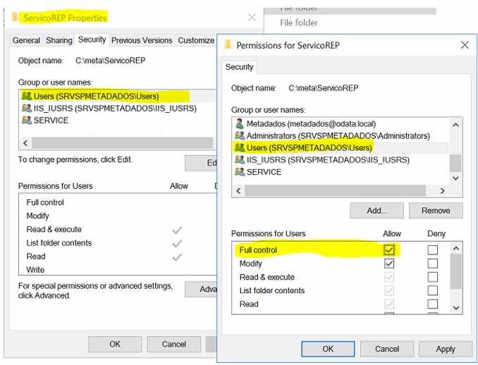 a) Acesse a pasta servicoREP. Clique com botão direito e escolha a opção Propriedades.