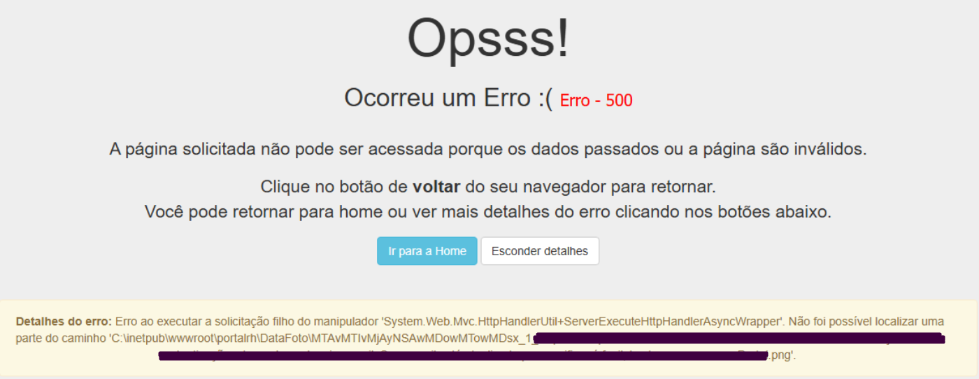 10/12/20XX 14:07:00: (System.IO.DirectoryNotFoundException) Não foi possível localizar uma parte do caminho 'C:\inetpub\wwwroot\portalrh\DataFoto\NOMEDOARQUIVO.png'. -