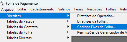 Arquivo >Diretrizes>Códigos Fixos da Folha