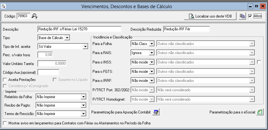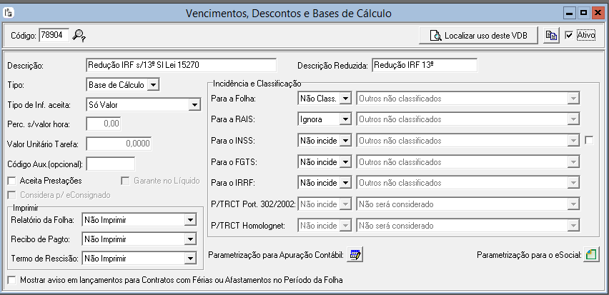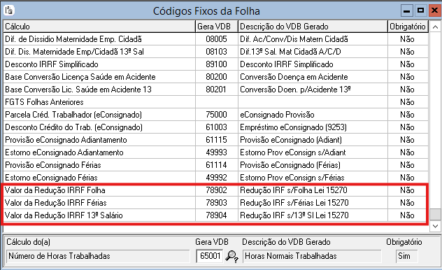 Vincular os novos VDB aos códigos fixos de redução IRF Folha, Férias e 13º Salário.