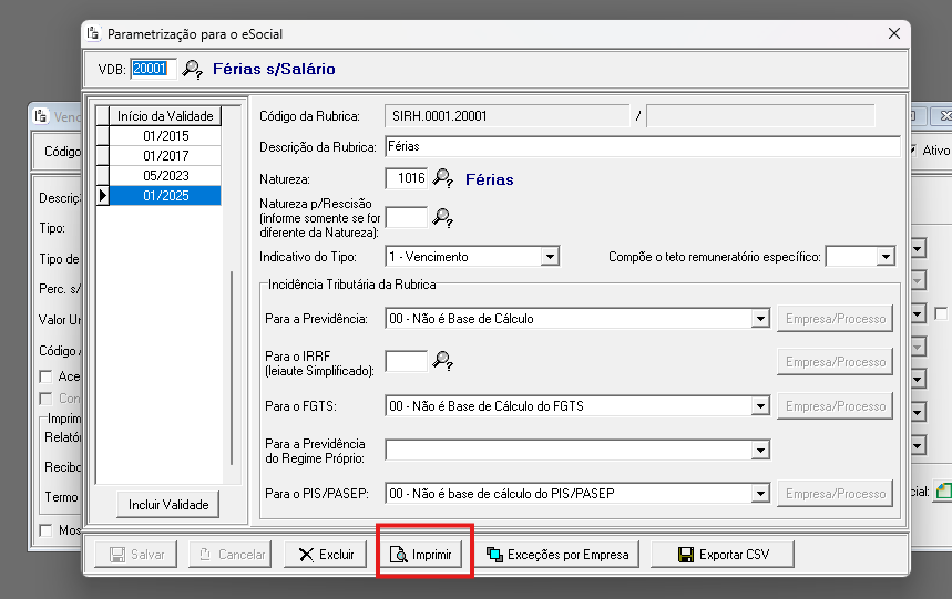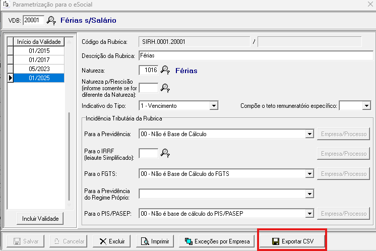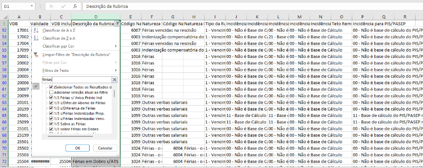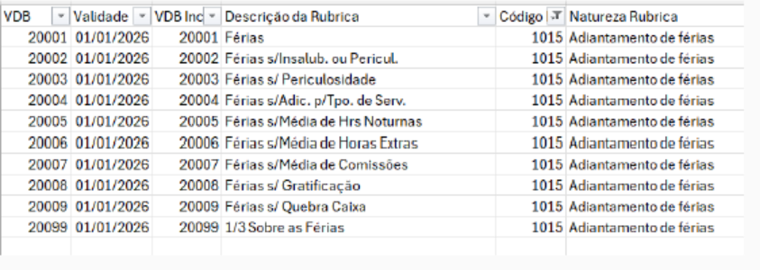 2º- Opção é exportar a tabela de rubricas para CSV e fazer o filtro as rubricas de férias