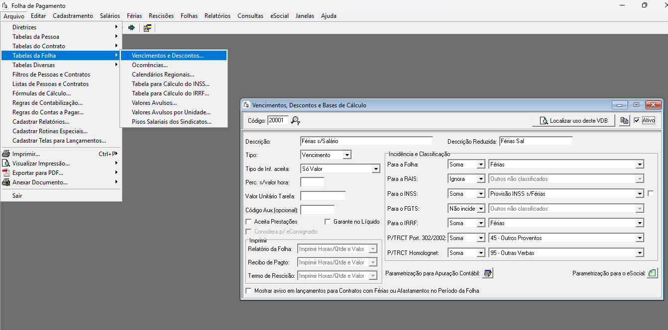 No módulo da folha de pagamento em Arquivo > Tabelas da folha > Vencimentos e Descontos.