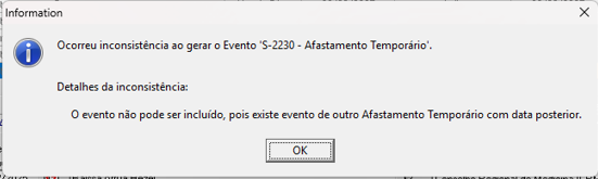 Ao lançar um novo registro de ocorrência ocorre a mensagem: S-2230 – Afastamento temporário O evento não pode ser incluir, pois existe evento de outro Afastamento Temporário com data posterior