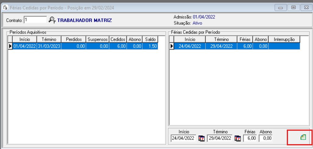 Após retornar no menu Férias > Atualiza Férias Cedidas, no Período aquisitivo do gozo das férias e clique no ícone Integração com eSocial para que o evento seja gerado.