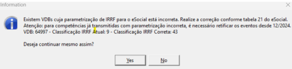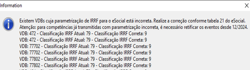 Existem vdbs cuja parametrização de IRRF para o esocial está incorreta 9 de janeiro de 2026 13:03 Atualizado Caso sistema apresente uma das informações abaixo: Siga as instruções contidas no artigo clicando Aqui! Não encontrou o que está procurando? Envie sua solicitação Artigos relacionados Conferências das Informações para Pré-preencher a Declaração do Imposto de Renda Pessoa Física (DIRPF) 2026 Existem VDBs cuja parametrização de IRRF para o eSocial está incorreta - folha mensal 12/2025 ⚠️ Atualização: Novas Naturezas de Rubricas Para Férias a Partir da Competência 01/2026 Classificação de Verbas e Planos de Saúde: Impactos e Cuidados no eSocial S-1010 - Tabela de Rubricas