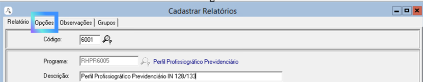 Para utilizar esse recurso, no módulo de Saúde Ocupacional ou Segurança do Trabalho, acesse o menu Arquivo > Cadastrar Relatório. Em seguida, informe o código do relatório ou localize-o pela descrição por meio da lupa e clique na guia Opções