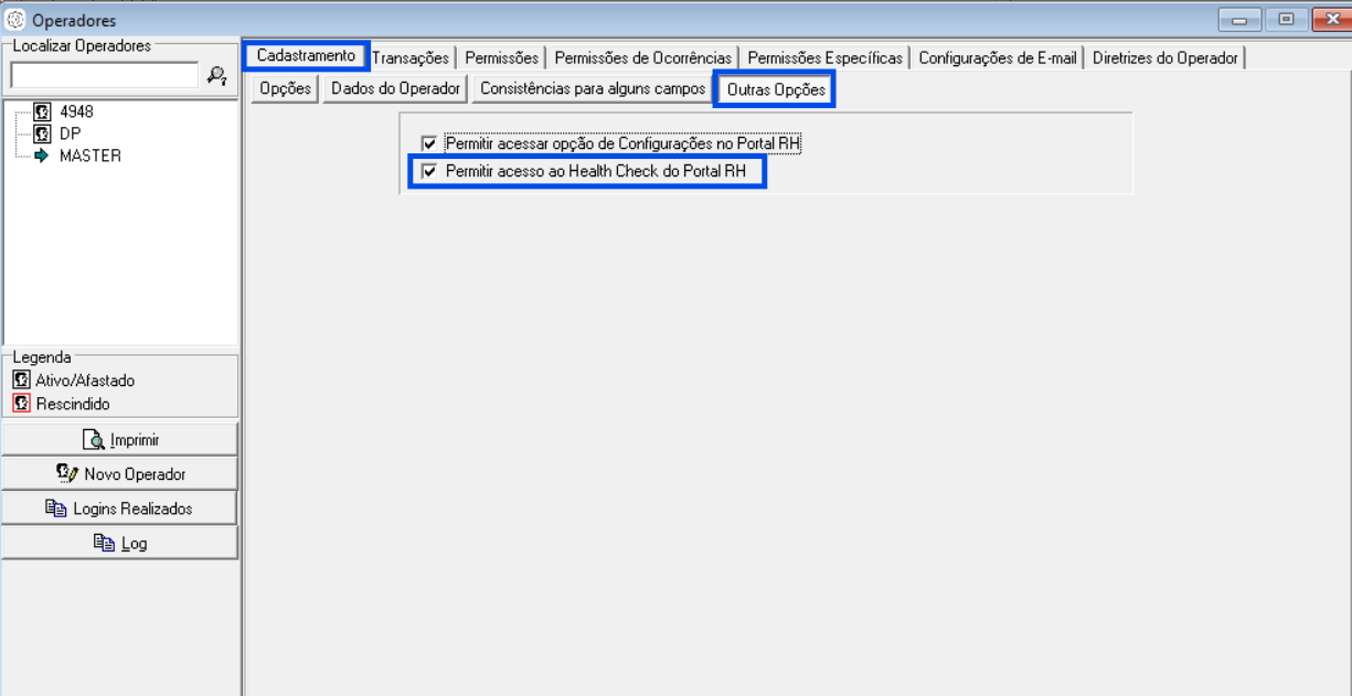 O Health Check é acessado pelo Portal RH apenas para usuários que tem operador no SIRH e que tem permissão para de acesso às configurações do Portal RH e permissão de acesso ao Health Check no cadastro do operador.