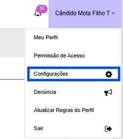 No Portal RH, acessar o menu vinculado ao nome do usuário que aparece no canto superior direito da tela