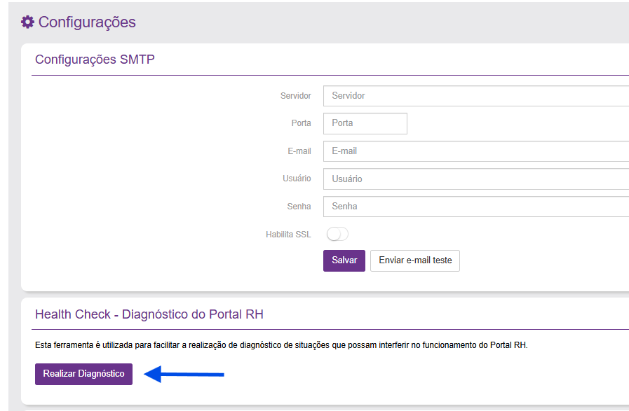 No grupo "Health Check - Diagnóstico do Portal RH", clicar no botão Realizar Diagnóstico: