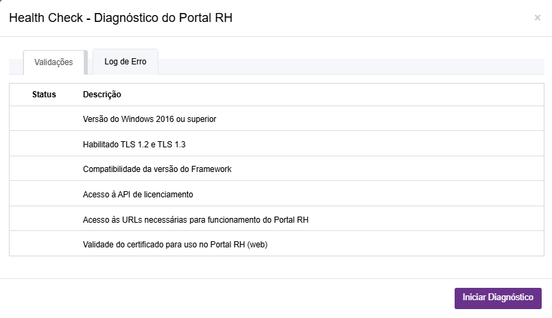 Nesta guia, ao clicar no botão Iniciar Diagnóstico, é possível realizar o diagnóstico de itens que podem impactar no funcionamento do Portal RH.
