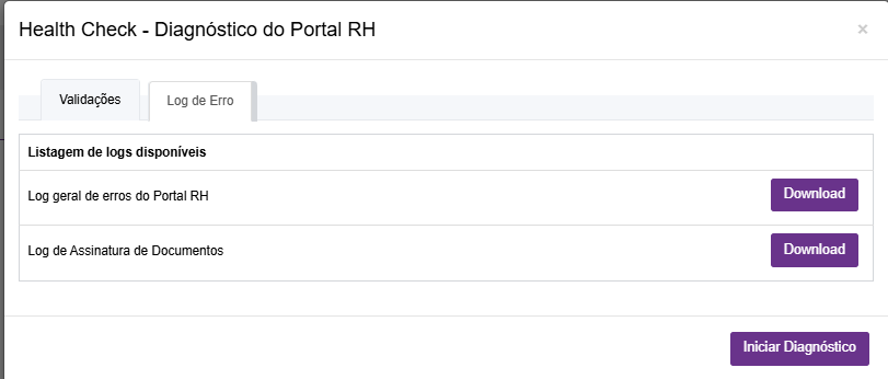 Nesta guia o acesso aos dois principais logs de erros do Portal RH foi facilitado. Antes, eles precisavam ser coletados diretamente no diretório de instalação do Portal RH, agora podemos realizar o download deles pelo Health Check. Os logs considerados nesta guia são o log geral do Portal RH e o log de assinatura de documentos. Para obte-los pelo Health Check, basta clicar no botão "Download" referente ao log desejado.
