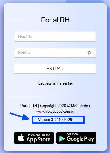 Validar a versão na qual o Portal RH está atualmente. A versão pode ser consultada ao acessar o Portal RH pelo navegador, na página de login, conforme print abaixo: