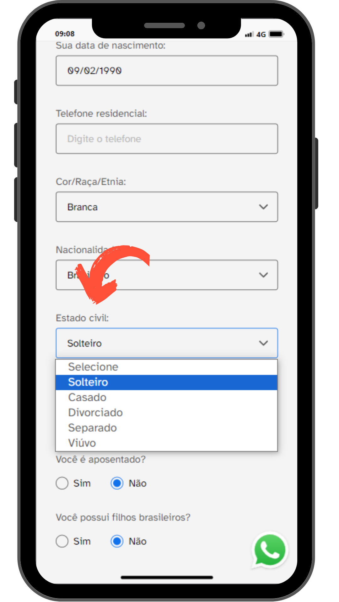 2. Procure pelo campo "Estado civil" e altere para o seu estado civil atual (ex: Solteiro(a), Casado(a), etc.).